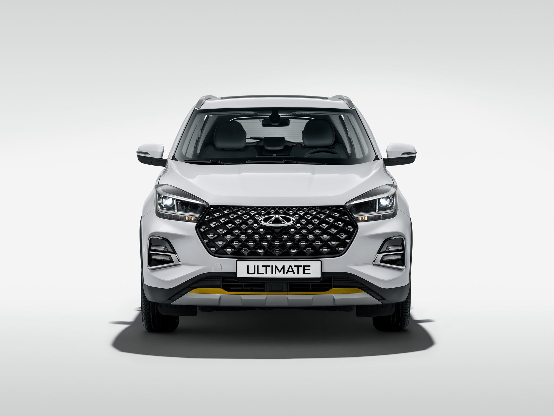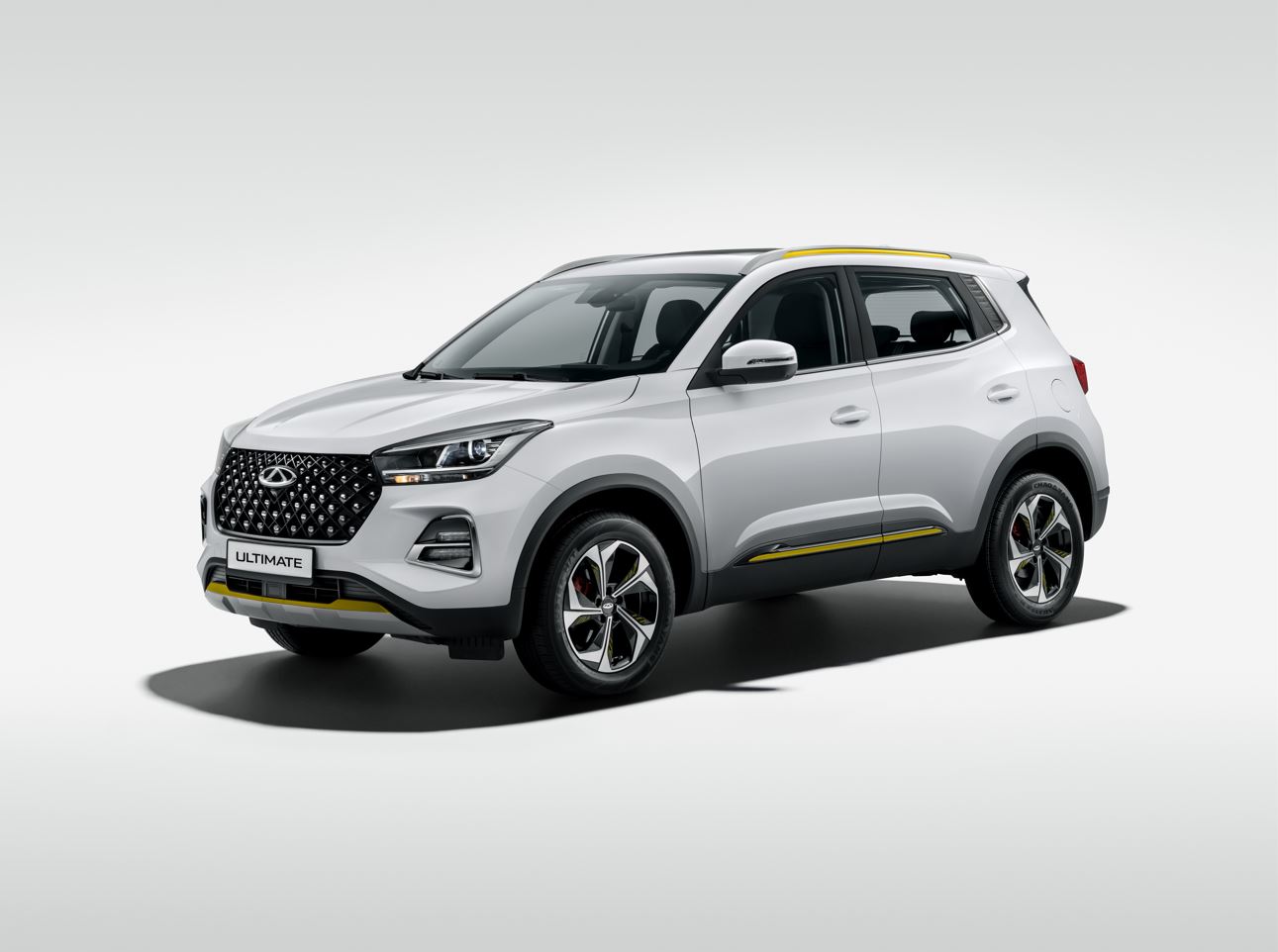 TIGGO 4 PRO ULTIMATE доступен для приобретения c черным кожаным салоном. На бампере, боковых молдингах и колесных дисках присутствуют акцентные детали желтого цвета, которые придают образу автомобиля спортивный и стильный вид.